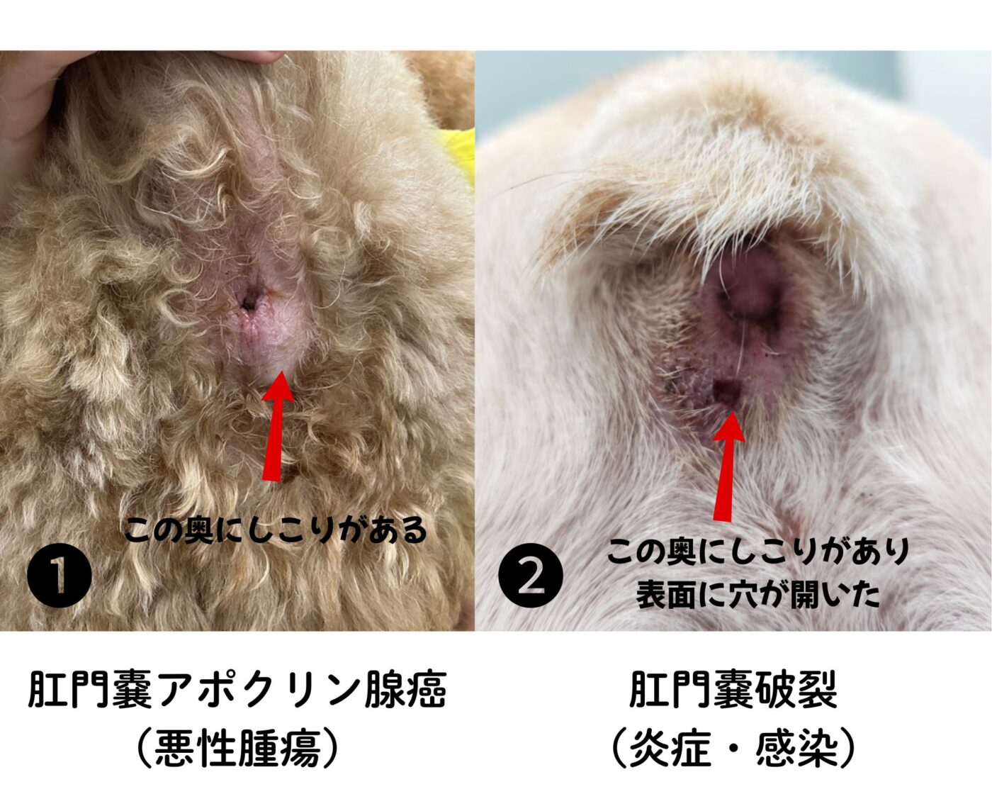 肛門の左右にある肛門腺が詰まったり、細菌感染を起こすと赤く腫れて”しこり”のように見えることがあります。