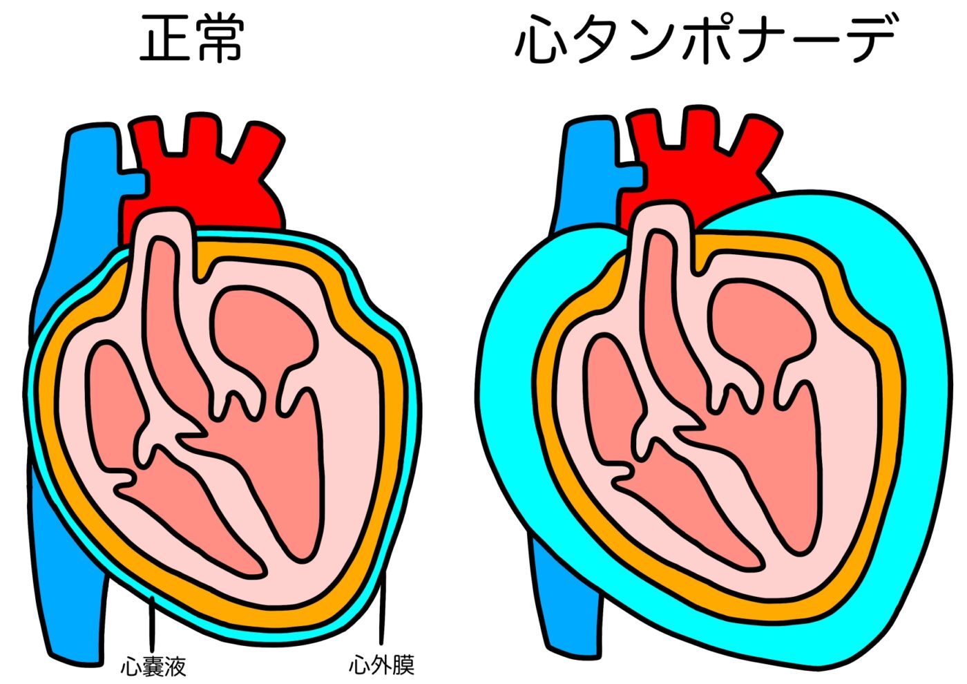 この心膜と心臓の隙間に何らかの原因で血液や水が貯まり、心臓が圧迫され動きが悪くなる状態を”心タンポナーデ”と呼びます。